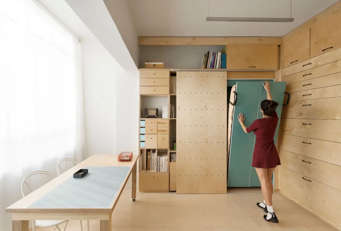 Small spaces with limited seating is solved through two floor cushions. Each cushion has a wide footprint for easy lounging and nests perfectly in either of the larger storage compartments.