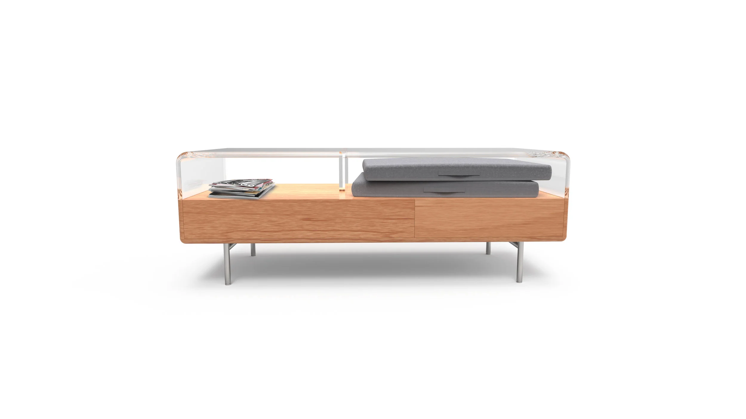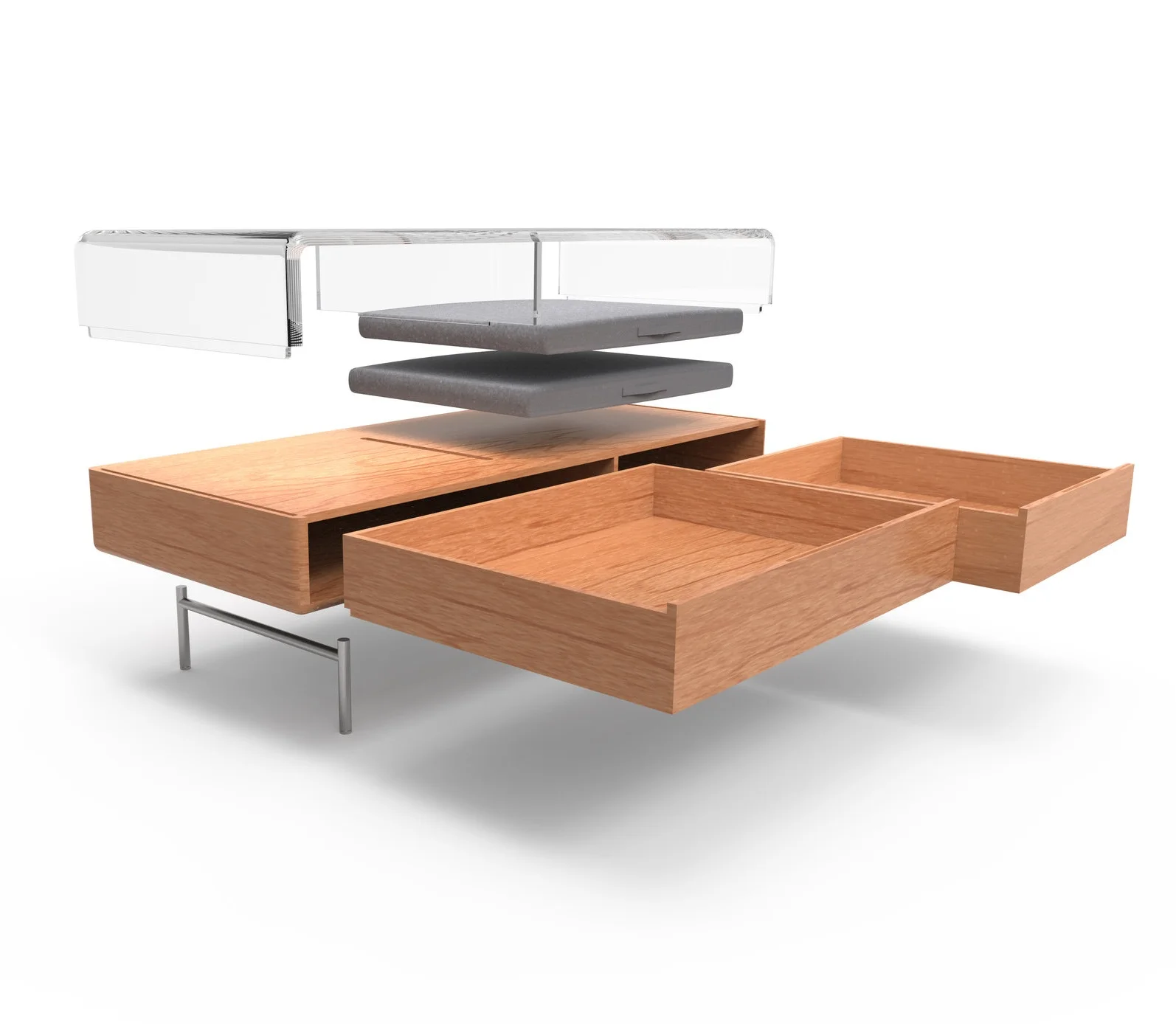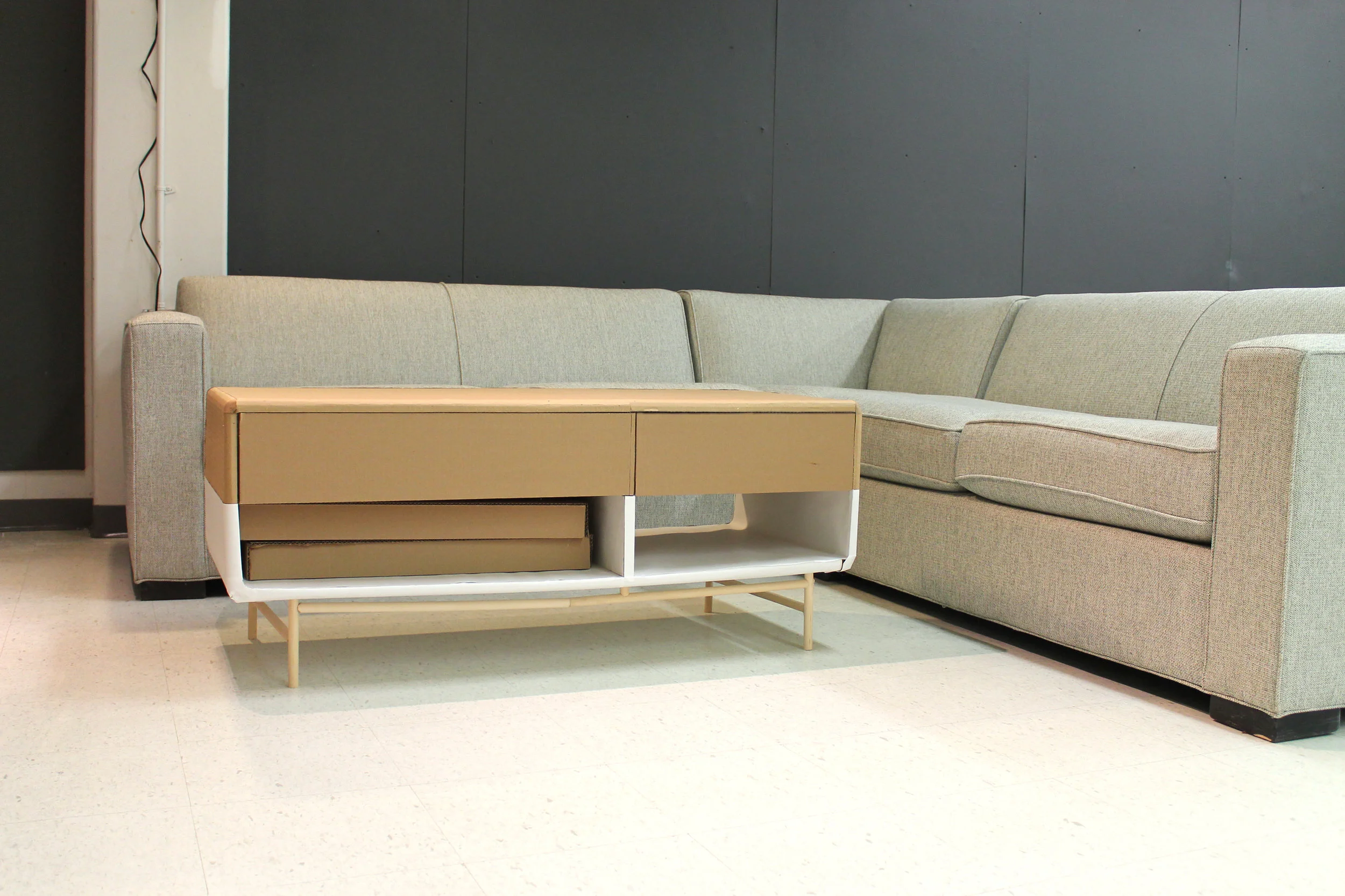 My decision to design a coffee table for this competition is based on its role in the living room space. It serves as the centerpiece of the living room, interacting with the user daily in formal and casual situations. In a small living space it has huge potential for storage impact. Many coffee tables forego the option of storage for aesthetic. I wanted to challenge myself by making use-able storage look visually light and appealing. Finally, a coffee table is arguably the best place to begin incorporating new and innovative materials into the home.